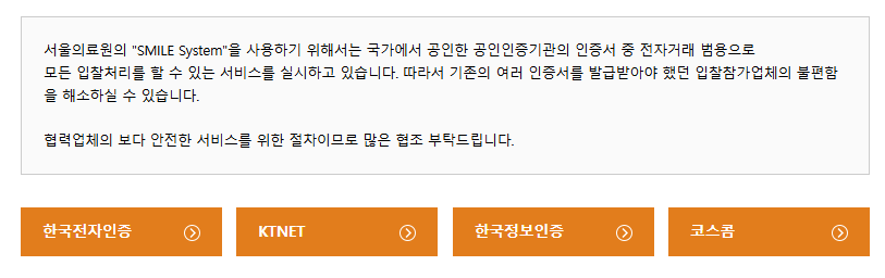 서울의료원 스마일시스템은 협력업체 신규등록, 입찰공고, 전자세금계산서 발급등의 업무를 지원합니다. 홈페이지 주소는 다음과 같습니다.