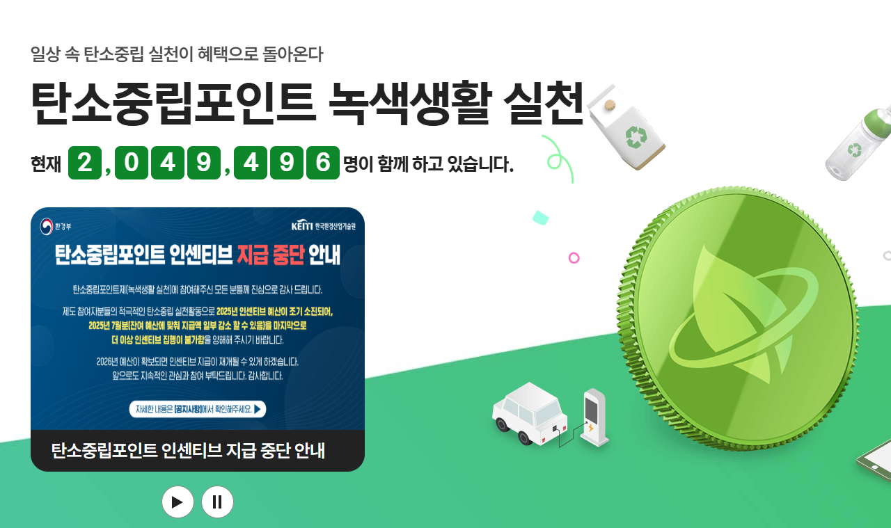 탄소중립포인트 녹색생활 실천은 개인이나 기업이 배출한 이산화탄소 등 온실가스를 줄일 수 있게 포인트를 지급하여 지원하는 정책입니다. 홈페이지 주소는 다음과 같습니다.