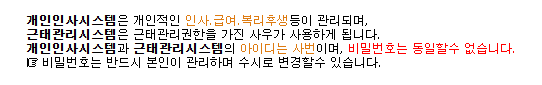 시스템 로그인은 사번을 아이디로 사용하며, 최초 비밀번호는 생년월일과 조직에서 정한 포맷으로 자동 설정됩니다. 최초 로그인 후에는 사용자 본인이 원하는 비밀번호로 반드시 변경해야 하며, 보안 강화를 위해 정기적인 비밀번호 변경이 요구됩니다.