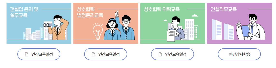 - 직무교육: 건설 관련 각종 직무 능력을 향상시키는 교육으로 온라인과 집합 교육이 혼합되어 있습니다.