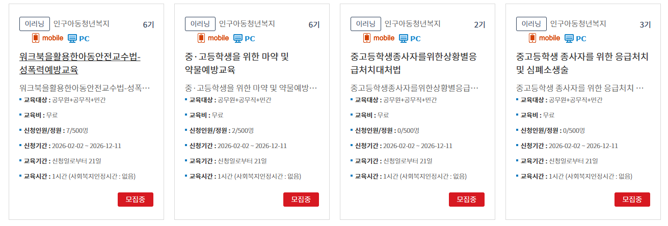 온라인 교육을 모두 이수하면 수료 처리가 되어 관련 기관에 교육 이력이 등록되거나 수료증을 받을 수 있습니다. 이를 통해 법정 의무교육 요건을 충족하거나, 아동 보호 관련 직무 수행 시 필요한 자격 요건을 갖출 수 있도록 지원합니다.