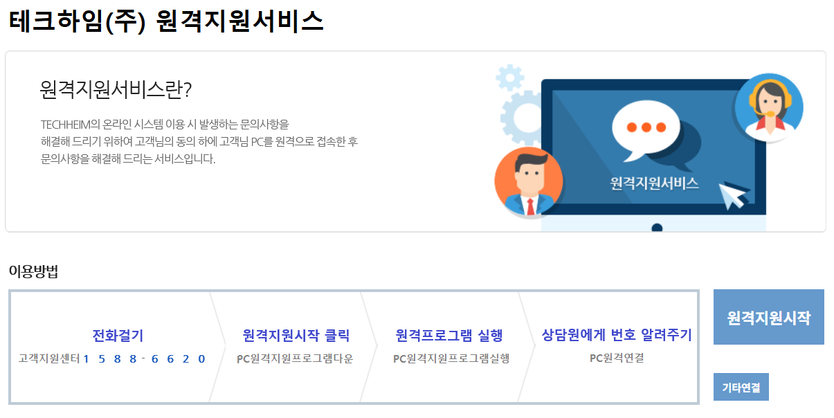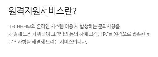 테크하임 원격지원서비스는 고객이 소프트웨어 사용중 겪는 문제를 원격으로 진단하고 해결할 수 있도록 제공하는 온라인 서비스입니다. 홈페이지 주소는 다음과 같습니다.