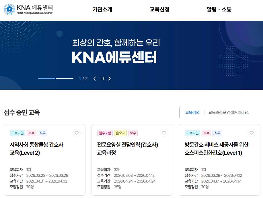 KNA 에듀센터는 간호사 여러분이 필요한 보수교육을 쉽게 찾고 이수할 수 있도록 만든 공식 교육 플랫폼입니다. 온라인·오프라인 과정을 잘 활용하셔서 전문성을 유지하는 데 도움이 되시길 바랍니다.
