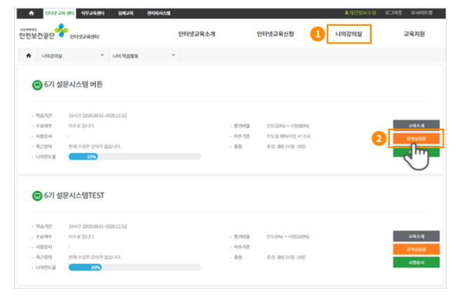 6. 상단 메뉴중 나의강의실 메뉴를 클릭하여 강의실에 입장 후 학습을 완료하세요.