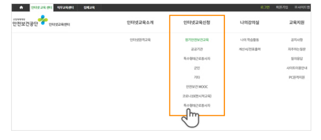 2. 로그인하신 후 상단 메뉴중에서 인터넷교육신청 메뉴로 접속하여 교육 유형을 선택하세요.