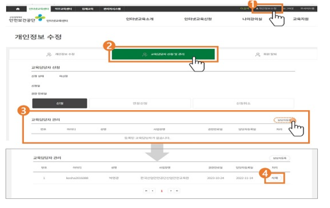 10. 교육 완료 후 [개인정보수정] > [기본정보 수정] 메뉴에서 수강생이 직접 교육담당자를 검색하여 지정 및 삭제할 수 있습니다. [교육담당자 신청] 및 담당자 아이디, 성명을 검색하여 [교육담당자 등록]이 가능합니다. 등록된 교육담당자 삭제를 원할 시, [삭제] 메뉴를 선택하세요.