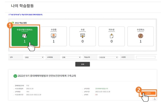 7. 수강을 원하지 않거나, 수료를 하지 못했을 경우 신청한 교육과정의 수강취소가 가능합니다. 수강취소는 [나의 학습활동 메뉴]에서 [수강신청/신청취소] 버튼을 클릭하여 신청가능합니다.