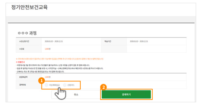 5. 교육수강료를 입금하기 위해 [가상계좌] 또는 [신용카드] 선택 후 결제를 진행하세요.